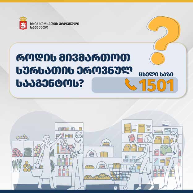 სურსათის ეროვნული სააგენტო მოქალაქეებს მოუწოდებს, სურსათის უვნებლობის მოთხოვნების დარღვევის შემთხვევაში, დაუყოვნებლივ დარეკონ სააგენტოს ცხელ ხაზზე.