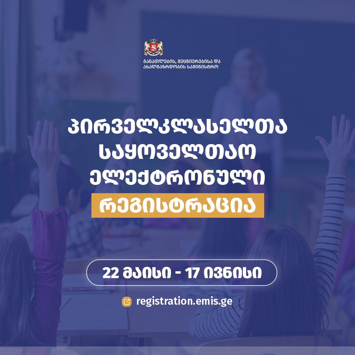 ხვალ, 22 მაისს, 09:00 საათზე, პირველკლასელთა მესამე ეტაპის რეგისტრაცია იწყება, რომელიც ელექტრონულ ფორმატში წარიმართება.