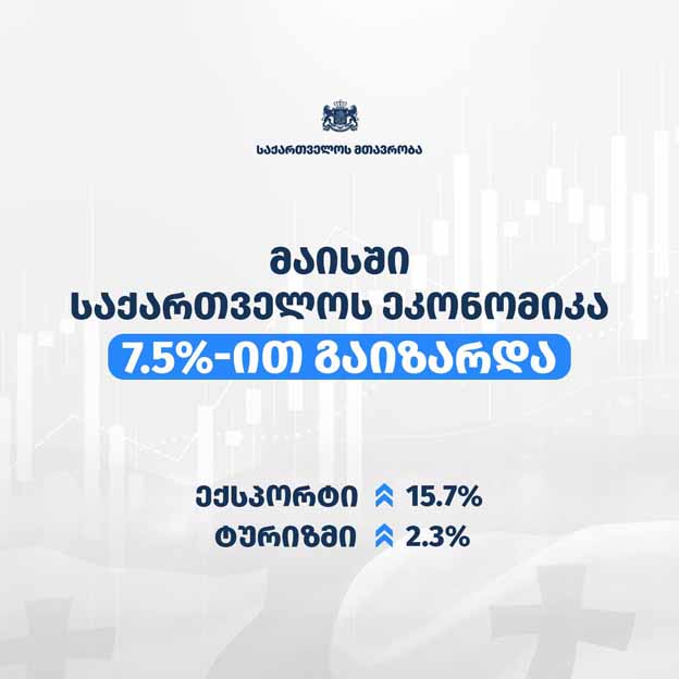 როგორც ინფორმაციაშია აღნიშნული, 2025 წლის იანვარ-მაისის საშუალო ეკონომიკური ზრდა 8.8%-ით განისაზღვრა. მაისში ექსპორტი 15.7%-ით გაიზარდა და 580.1 მილიონი აშშ დოლარი შეადგინა.
