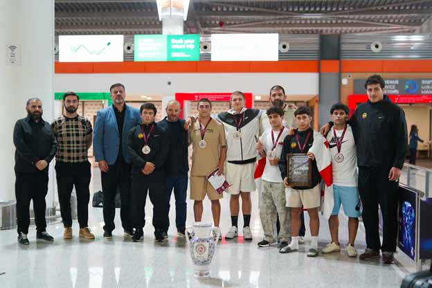 სპორტსმენებს ადგილობრივი ხელისუფლების წარმომადგენლები და გულშემატკივრები აეროპორტში დახვდნენ.