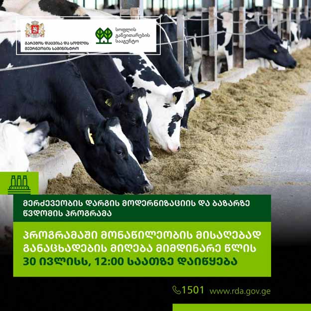 „მერძევეობის დარგის მოდერნიზაციის და ბაზარზე წვდომის პროგრამაში“ განაცხადების მიღება ხვალ, 30 ივლისის 12:00 საათზე დაიწყება და ბიუჯეტის ამოწურვამდე (3 მლნ ლარი) გაგრძელდება.