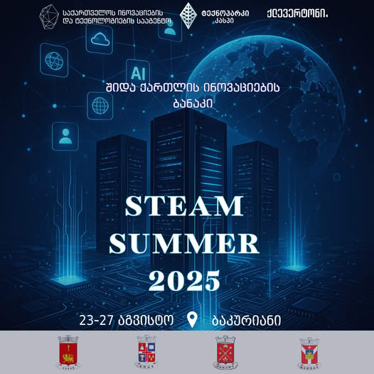 ბანაკი - STEAM SUMMER 2025 - კასპის ტექნოპარკის, საქართველოს ინოვაციების და ტექნოლოგიების სააგენტოს დაფინანსებით და კასპის, გორის, ქარელის და ხაშურის მუნიციპალიტეტების თანადაფინანსებით იმართება და ღონისძიების ორგანიზატორების ინფორმაციით, პროექტი შიდა ქართლის რეგიონში მცხოვრები ახალგაზრდების STEAM დარგებით დაინტერესებას ისახავს მიზნად.