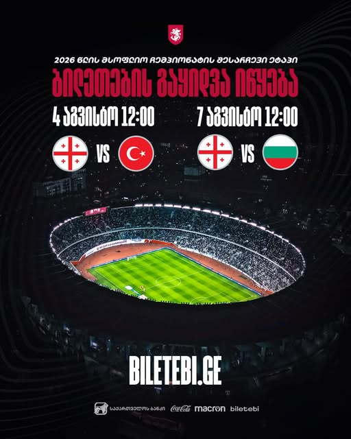 საქართველო-თურქეთის საფეხბურთო მატჩზე დასასწრები ბილეთების გაყიდვა დღეს დაიწყო. ხოლო საქართველო-ბულგარეთის თამაშის ბილეთების რეალიზაცია 7 აგვისტოს დაიწყება.