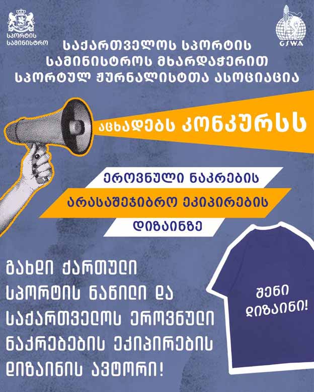 საქართველოს სპორტის სამინისტროს მხარდაჭერით, სპორტულ ჟურნალისტთა ასოციაცია ეროვნული ნაკრების არასაშეჯიბრო ეკიპირების დიზაინზე კონკურსს აცხადებს.