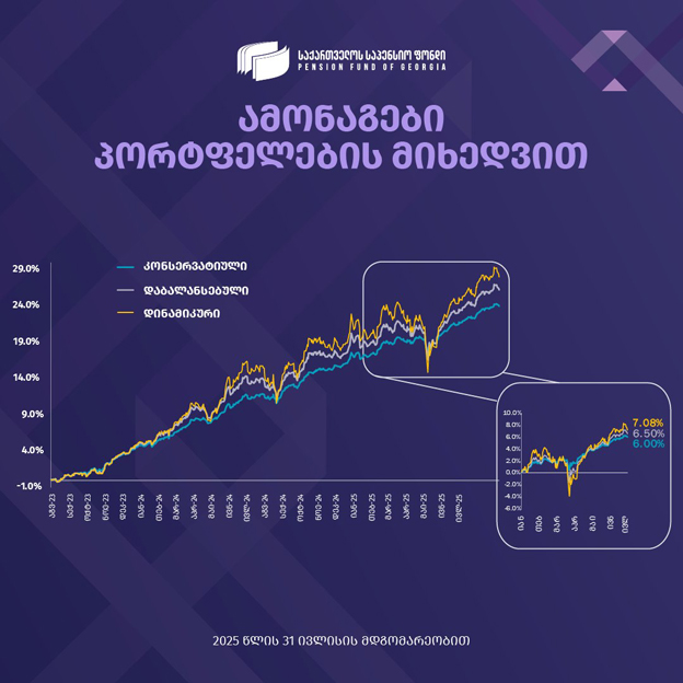 „ივლისში, ყველაზე მაღალი - 0.62%-იანი - ზრდა კონსერვატიულმა პორტფელმა აჩვენა, ხოლო დაბალანსებული და დინამიკური პორტფელები შესაბამისად 0.51% და 0.20%-ით გაიზარდა. ამასთან, აღსანიშნავია, რომ ივლისში სამომხმარებლო ფასების ინდექსის კლებამ 0.17% შეადგინა, რაც პორტფელების რეალურ ამონაგებზე დადებითად აისახა.