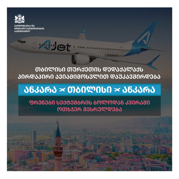 დაბალბიუჯეტური ავიაკომპანია Ajet-ი ანკარა - თბილისი - ანკარას საჰაერო ხაზზე რეგულარული საჰაერო მიმოსვლის განხორციელებას იწყებს.