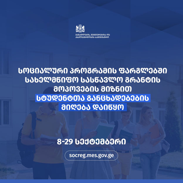 სტუდენტთა ხელშეწყობის მიზნით, საქართველოს განათლების, მეცნიერებისა და ახალგაზრდობის სამინისტროში სოციალური პროგრამის ფარგლებში ელექტრონული განცხადებების მიღება დაიწყო.