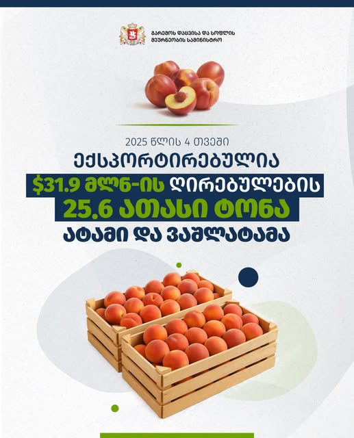 2025 წლის 1-ელი მაისიდან 7 სექტემბრის ჩათვლით, საქართველოდან 25.6 ათასი ტონა ატამი და ვაშლატამაა ექსპორტირებული, რომლის ღირებულებამ 31.9 მლნ აშშ დოლარი შეადგინა.