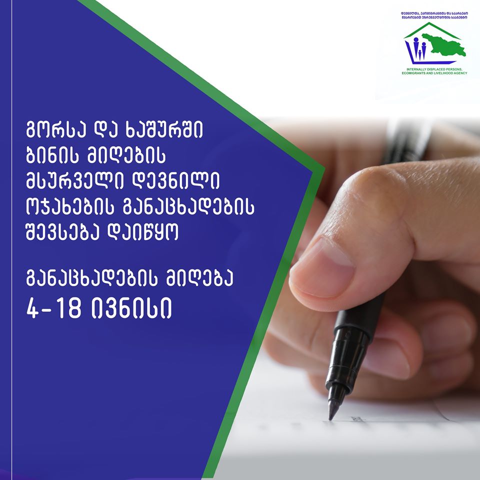 დევნილ ოჯახებს, რომლებიც ამ დრომდე, სახელმწიფოსგან საცხოვრებელი არ დაკმაყოფილებულან, გორსა და ხაშურში ბინის მიღების მოთხოვნით განაცხადების შევსება უკვე შეუძლიათ. აღნიშნული პროცესი დღეიდან დაიწყო და 18 ივნისის ჩათვლით გაგრძელდება.