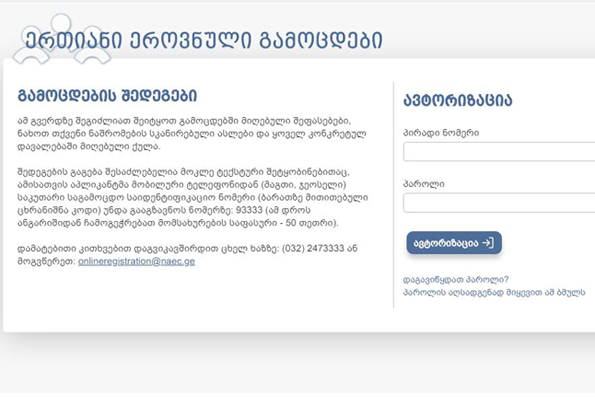 შეგახსენებთ, რომ საკუთარი შედეგის გასაგებად აბიტურიენტი უნდა შევიდეს ვებ.გვერდზე online.naec.ge, შესაბამის ველში კი, მიუთითოს პირადი ნომერი და ხუთნიშნა კოდი. ამასთან,