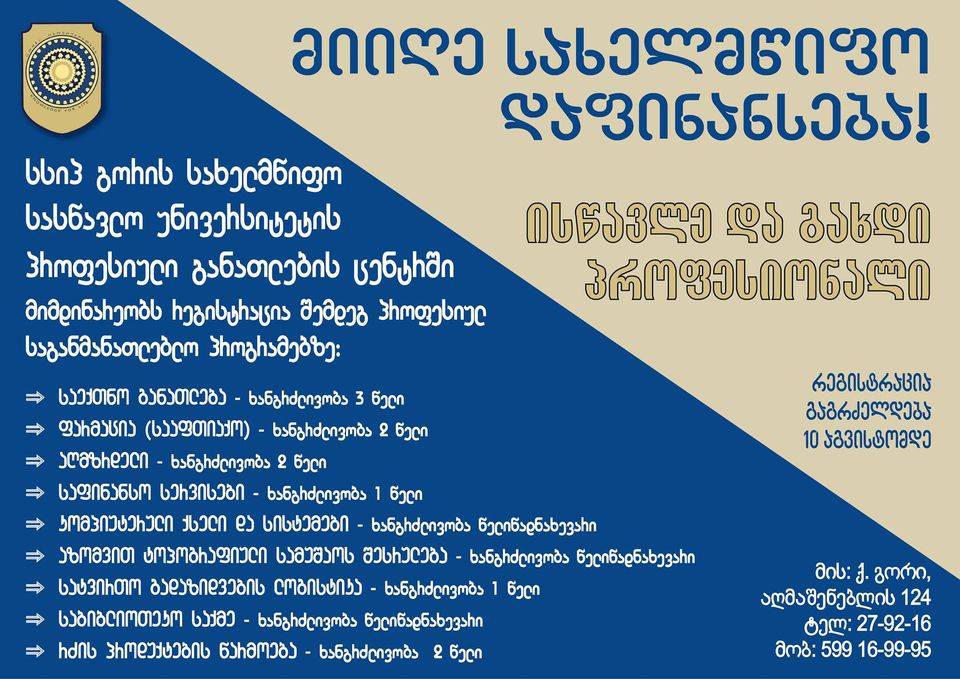 გორის სახელმწიფო სასწავლო უნივერსიტეტის პროფესიული განათლების ცენტრში, სტუდენტები სახელმწიფოს დაფინანსებით დაეუფლებიან სასურველ პროფესიას. ამასთან, მთავრობის შესაბამისი გადაწყვეტილების საფუძველზე, წელს ჩარიცხულ სტუდენტებს სავალდებულო სამხედრო სამსახურში გაწვევაც გადაუვადდებათ.