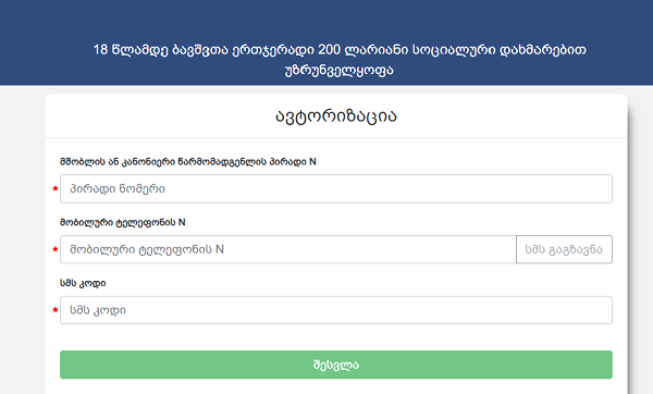 საქართველოს მოქალაქე 0-დან 17 წლის ჩათვლით იმ ბავშვებზე, რომელთა რეგისტრაციაც სპეციალურ პორტალზე უკვე აისახა, ერთჯერადი 200 ლარიანი დახმარების ჩარიცხვა დღეიდან დაიწყება.