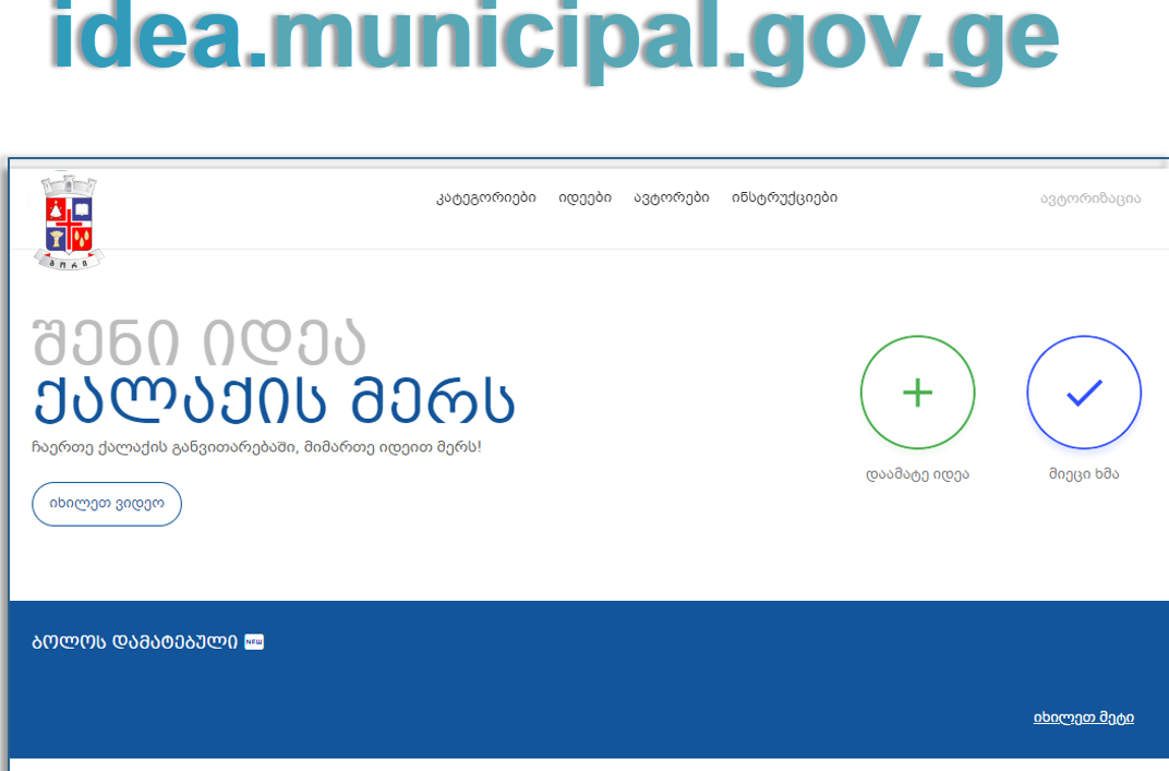 „შენი იდეა მერს“, ერთ-ერთი მოდულია ერთიანი ელექტრონული მმართველობის სისტემისა, რომელიც გორის მუნიციპალიტეტში რამდენიმე კვირის წინ ამუშავდა. idea.municipal.gov.ge - ეს არის თვითმმართველობის საქმიანობაში ინიციატივების ონლაინ წარდგენის მექანიზმი, რაც მოსახლეობას მუნიციპალიტეტის განვითარებაში მონაწილეობის მორიგ შესაძლებლობას აძლევს. რაც შეეხება პორტალით სარგებლობის ინსტრუქციას, idea.municipal.gov.ge - ზე ავტორიზაციის შემდეგ პლუს ღილაკის საშუალებით იხსნება ფანჯარა, სადაც გვხდება თემატური კატეგორიები. სასურველი კატეგორიის შერჩევის შემდეგ შესაძლებელია ახალი იდეის რეგისტრაცია. გარდა ინიციატივის წარდგენისა, საიტის საშუალებით მოქალაქეებს შეუძლიათ გაეცნენ სხვების მიერ რეგისტრირებულ იდეებს, სურვილის შემთხვევაში მოიწონონ და ხმა მისცენ კიდეც ნებისმიერ მათგანს. ხმის მიცემის პროცესი იწყება ინიციატივის ვებგვერდზე გამოქვეყნების შემდეგ. საჭირო რაოდენობის ხმების დაგროვების შემდეგ, იდეა ეგზავნება შესაბამის სტრუქტურულ ერთეულს რესურსებისა და შესაძლებლობების მოძიების მიზნით. დამუშავების შემდეგ კი, ინციატივა მერს წარედგინება განსახილველად“, - ამბობენ გორის მერიაში.