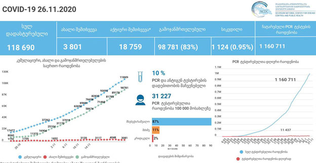 საქართველოში ბოლო 24 საათის განმავლობაში გამოვლენილია კორონავირუსით ინფიცირების 3801 ახალი დადასტურებული შემთხვევა, - აღნიშნული ინფორმაცია დაავადებათა კონტროლისა და საზოგადოებრივი ჯანმრთელობის ეროვნული ცენტრის ოფიციალურ გვერდზე ცოტა ხნის წინ განთავსდა.