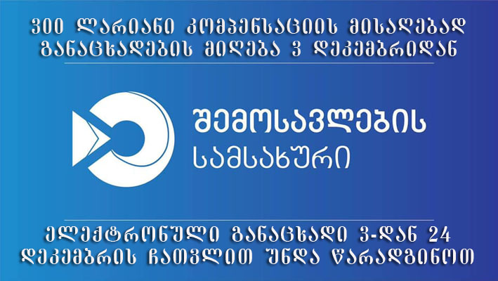 ხვალიდან, 3 დეკემბრიდან, 300-ლარიანი კომპენსაციის მისაღებად განაცხადების მიღება იწყება. საქართველოს შემოსავლების სამსახურის მიერ გავრცელებული ინფორმაციით, იმ პირებს, რომლებსაც 2020 წლის 28 ნოემბრიდან დაწესებული შეზღუდვების გამო შეჩერებული აქვთ საქმიანობის განხორციელების (ობიექტზე მომხმარებელთა სარეალიზაციო სივრცეში დაშვების/წვდომის უფლება), 3 დეკემბრიდან 24 დეკემბრის ჩათვლით, უნდა წარმოადგინონ ელექტრონული განაცხადი (ელექტრონული განაცხადის წარდგენის შემდეგ პირს კიდევ 2 დღე ეძლევა ინფორმაციის დასაზუსტებლად, 28 დეკემბრის ჩათვლით), რათა რეგისტრაციის შემდეგ მიიღონ ერთჯერადი 300 ლარიანი კომპენსაცია.