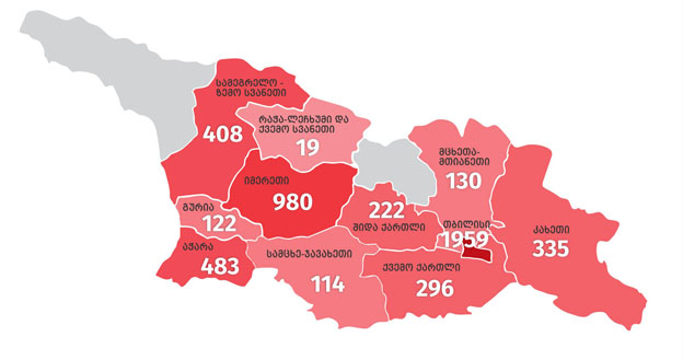 „დღეს გამოვლენილი ინფიცირების 5 068 ახალი შემთხვევიდან, დედაქალაქისა და რეგიონების მიხედვით მაჩვენებლები გამოიყურება შემდეგი სახით: თბილისში გამოვლენილია 1 959 შემთხვევა, აჭარაში - 483, იმერეთში - 980, ქვემო ქართლში - 296, შიდა ქართლში - 222, გურიაში - 122, სამეგრელო-ზემო სვანეთში - 408, კახეთში - 335, მცხეთა-მთიანეთში - 130, სამცხე-ჯავახეთში - 114, რაჭა-ლეჩხუმსა და ქვემო სვანეთში - 19“, - განაცხადა ბერდია სიჭინავამ.