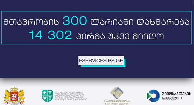 მთავრობის 300-ლარიანი დახმარების გაცემა დაიწყო, ბენეფიციარებისთვის კუთვნილი კომპენსაციების დარიცხვა გუშინ დაიწყო. ჯანდაცვის სამინისტროს სსიპ დასაქმების ხელშეწყობის სახელმწიფო სააგენტოს ინფორმაციით, დღეის მდგომარეობით, დახმარება 14 302 პირმა უკვე მიიღო.