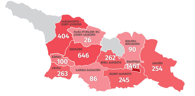 „დღეს ქვეყანაში გამოვლენილი ინფიცირების 3 837 ახალი შემთხვევიდან: თბილისში გამოვლენილია 1 461 შემთხვევა, აჭარა - 263, იმერეთი - 646, ქვემო ქართლი - 245, შიდა ქართლი - 262, გურია - 100, სამეგრელო და ზემო სვანეთი - 404, კახეთი - 254, მცხეთა-მთიანეთი - 90, სამცხე-ჯავახეთი - 86, რაჭა-ლეჩხუმი და ქვემო სვანეთი - 26“, - განაცხადა ბერდია სიჭინავამ.