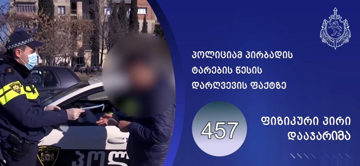 უწყების ცნობით, პირბადის ტარების წესის დარღვევისთვის დაჯარიმდა 457 პირი.