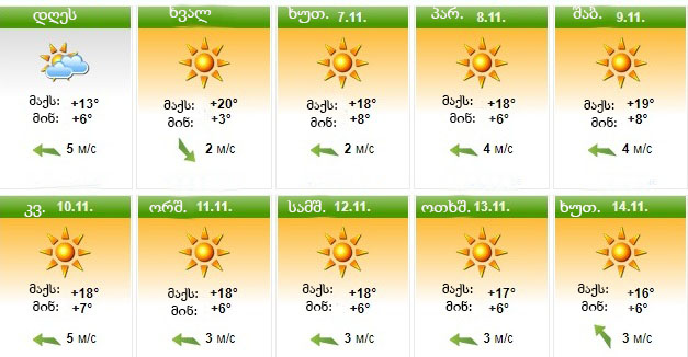 15 ნოემბრამდე გორის მუნიციპალიტეტში მზიანი ამინდი შენარჩუნდება. უახლოესი 9 დღის განმავლობაში, ნალექი მოსალოდნელი არ არის, ტემპერატურა დღისით +19-20 გრადუსს მიაღწევს, ღამით კი +3-6 გრადუსი დაფიქსირდება.