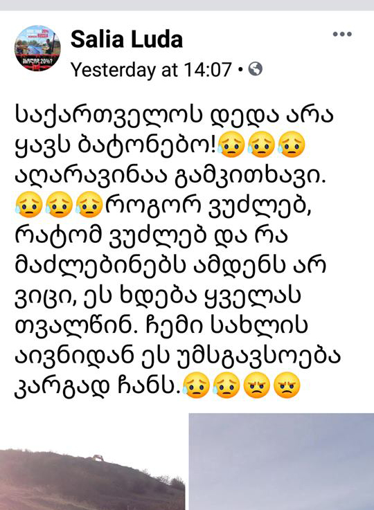 ,,სულ ტყუილია ეგ განცხადება, აგერ, თავიანთ კონტროლირებად ტერიტორიაზე იყვნენ, ტრაქტორი და კამაზები ჰყავდათ და ხრეშს ზიდავდნენ, სხვა არაფერი მომხდარა, ლუდა სალია ალბათ, სხვანაირად ხედავს, მთელი დღე აქ ვარ, სკოლის დარაჯად ვმუშაობ და აქედან ვუყურებდი რას აკეთებდენენ“, - აცხადებს ხურვალეთში მცხოვრები ბადრი წიქარიძე.