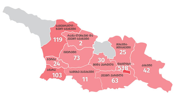დღეს ქვეყანაში გამოვლენილი ინფიცირების 1 030 ახალი შემთხვევიდან, თბილისში გამოვლენილია 538 შემთხვევა, აჭარა - 103, იმერეთი - 73, ქვემო ქართლი - 63, შიდა ქართლი - 30, გურია - 24, სამეგრელო - ზემო სვანეთი - 119, კახეთი - 42, მცხეთა-მთიანეთი - 25, სამცხე-ჯავახეთი - 11, რაჭა-ლეჩხუმი და ქვემო სვანეთი - 2.