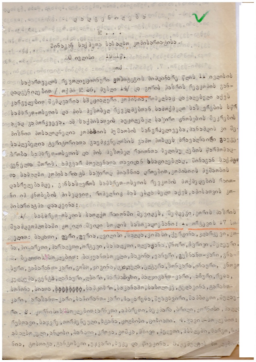 შინაგან საქმეთა სახალხო კომისარიატის 1921 წლის 20 ივლისის დადგენილების თანახმად, საქართველოს რევოლუციონური კომიტეტის 11 ივლისის დადგენილების საფუძველზე /ოქმი N36, მუხლი 14/ და გორის მაზრის რევკომის განკარგულებით შედგა სპეციალური კომისია, რომელსაც დავალებული ჰქონდა სამხრეთ ოსეთსა და მის მეზობელ რევკომებთან სამოქმედო საზღვრების სწრაფად გამორკვევა.