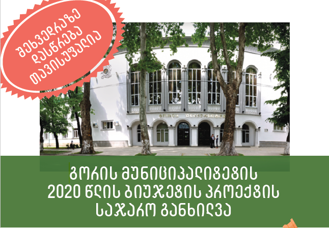 22 ნოემბერს, 13 საათსა და 30 წუთზე, გორის სახელმწიფო სასწავლო უნივერსიტეტის იაკობ გოგებაშვილის სახელობის დარბაზში (მის: ქალაქი გორი, ილია ჭავჭავაძის ქუჩა #53), გორის მუნიციპალიტეტის 2020 წლის ბიუჯეტის პროექტის განხილვა მოეწყობა.