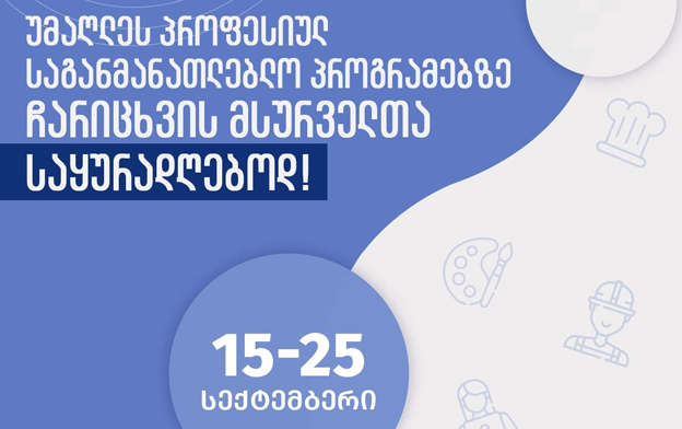 უწყების ცნობით, პროფესიული განათლების მიღების მსურველები, ვინც 2021 წელს უმაღლეს პროფესიულ საგანმანათლებლო პროგრამებზე დარეგისტრირდნენ და ახალი კორონავირუსის (COVID 19) გავრცელების პირობებში ვერ შეძლეს ტესტირებაზე (ზოგადი უნარები, ქიმია-ბიოლოგია) გამოცხადება, 2021 წლის 15 სექტემბრიდან 25 სექტემბრის ჩათვლით, დასაბუთებული განცხადებით უნდა მიმართონ საქართველოს განათლებისა და მეცნიერების სამინისტროს ელექტრონულ ფოსტაზე: doc.info@mes.gov.ge.