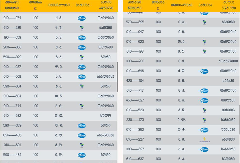 აქვე, აღნიშნულია გამარჯვებულების ინიციალები, პირადი ნომრის პირველი და ბოლო ციფრები და დასახელებულია, თუ რომელი ვაქცინითაა აცრილი პირი, ამასთან, მითითებულია გამარჯვებულის საცხოვრებელი მუნიციპალიტეტიც.