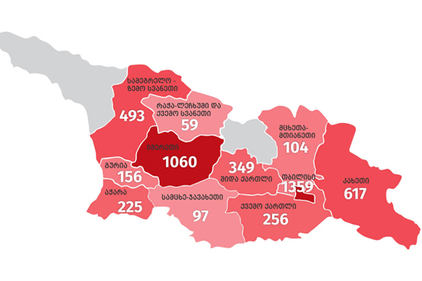 დღეს ქვეყანაში გამოვლენილი ინფიცირების 4 775 ახალი შემთხვევიდან თბილისში დადასტურდა 1 359 შემთხვევა, აჭარა - 225, იმერეთი - 1 060, ქვემო ქართლი - 256, შიდა ქართლი - 349, გურია - 156, სამეგრელო - ზემო სვანეთი - 493, კახეთი - 617, მცხეთა-მთიანეთი - 104, სამცხე-ჯავახეთი - 97, რაჭა-ლეჩხუმი და ქვემო სვანეთი - 59.