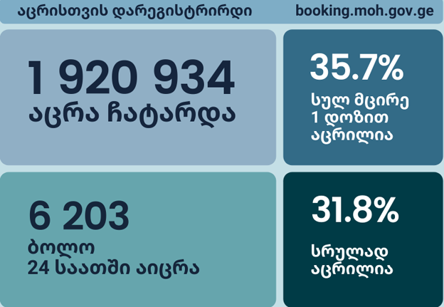 უწყების ცნობით, დღეის მონაცემებით, საქართველოში სრულად ვაქცინირებულია მოზრდილი მოსახლეობის 31.8%.