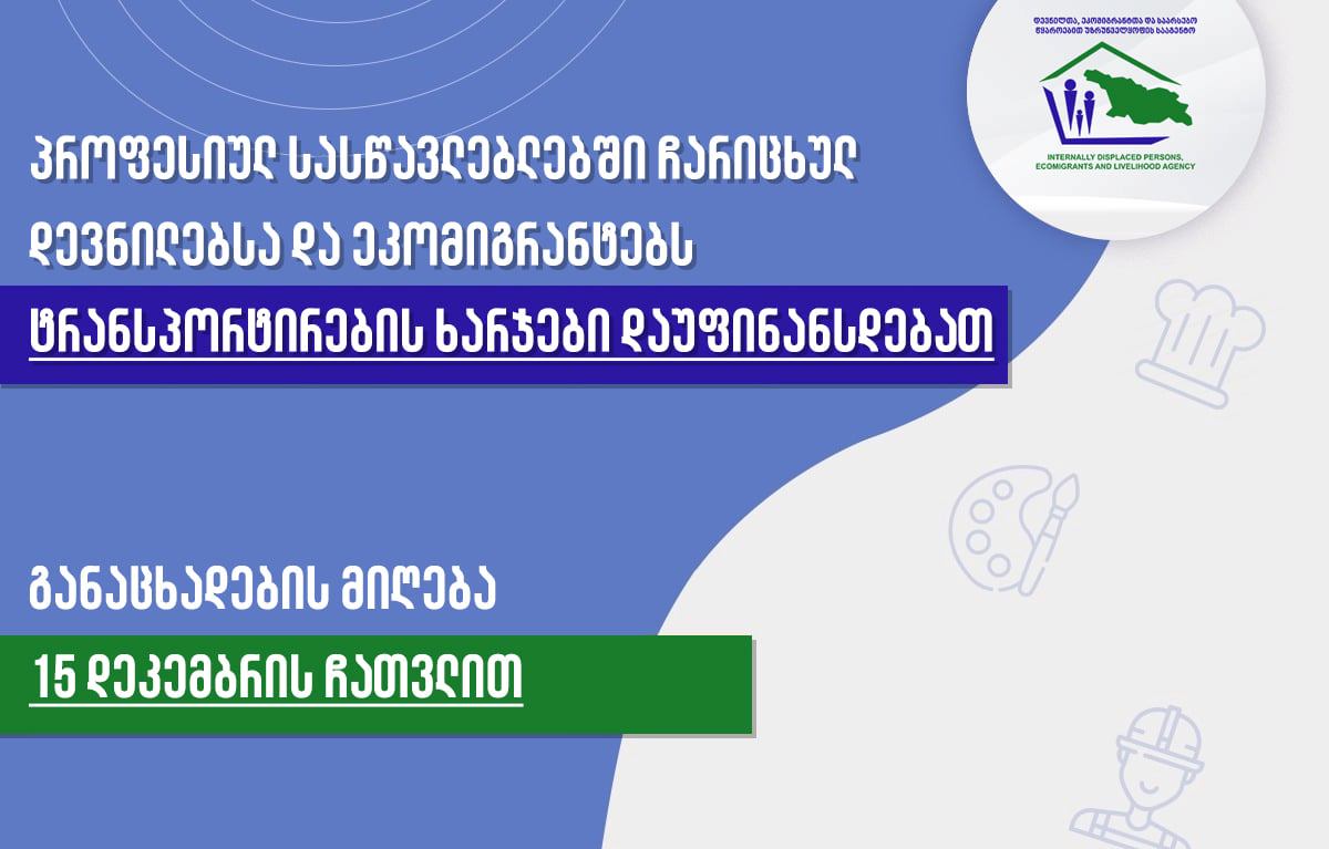 დევნილთა, ეკომიგრანტთა და საარსებო წყაროებით უზრუნველყოფის სააგენტო სახელმწიფო პროფესიულ საგანმანათლებლო დაწესებულებებში ჩარიცხულ იძულებით გადაადგილებულ პირებს, სწავლის პერიოდში, ტრანსპორტირების ხარჯებს დაუფინანსებს.