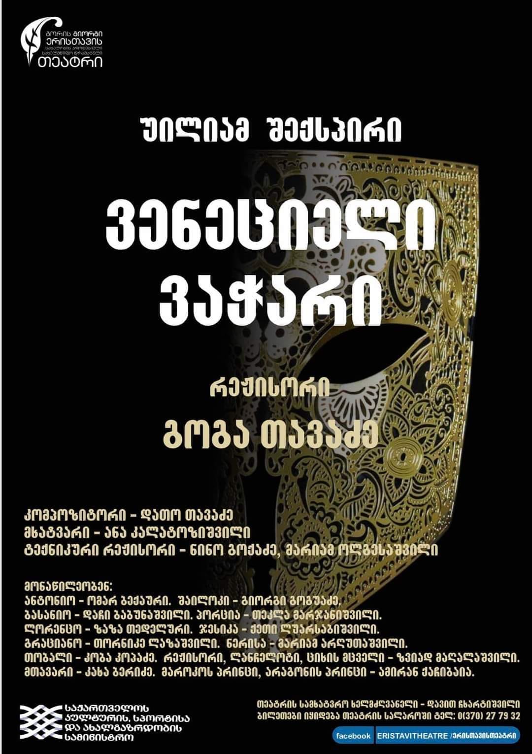 გიორგი ერისთავის სახელობის დრამატულ თეატრში მორიგი პრემიერისთვის ემზადებიან. დღეს და ხვალ, 22- 23 დეკემბერს, 19:00 საათზე, მაყურებელი თეატრის დიდ სცენაზე, „ვენეციელ ვაჭარს“ იხილავს.
