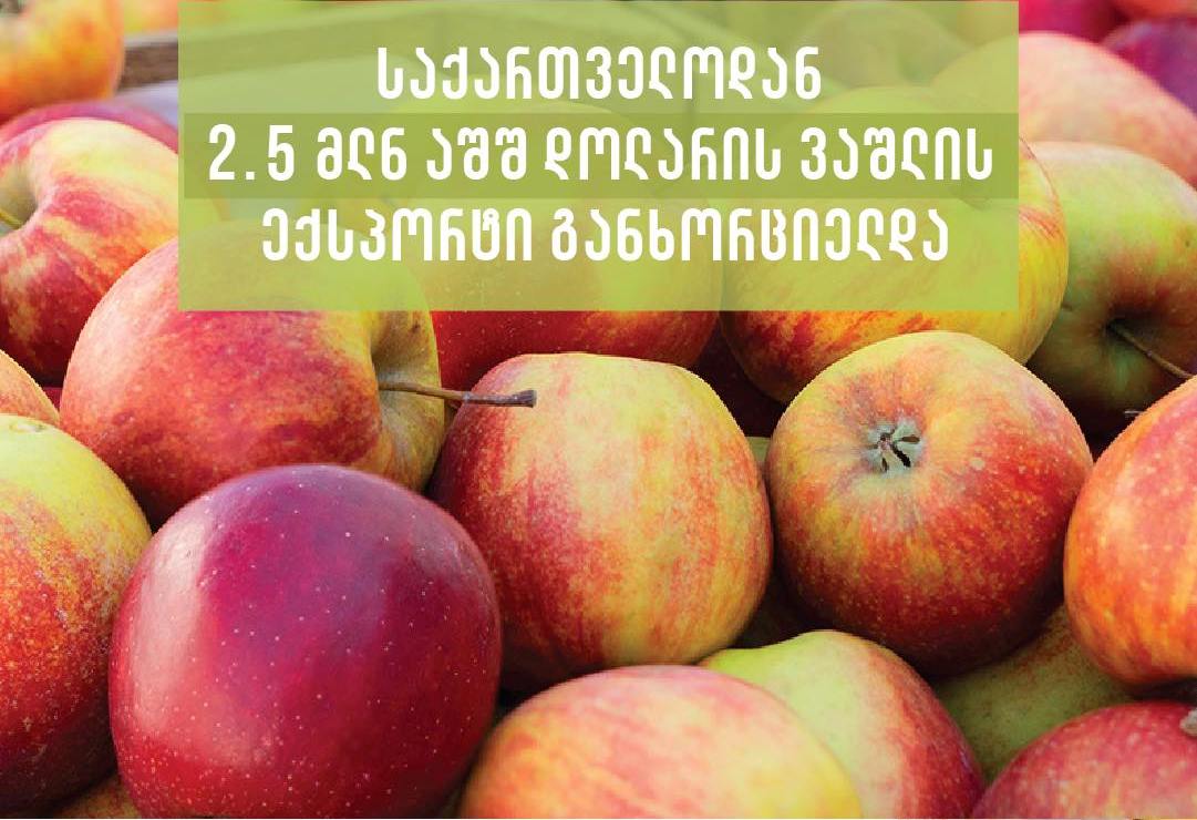 2021 წლის 1-ლი აგვისტოდან 2021 წლის 26 დეკემბრამდე პერიოდში, საქართველოდან, 3 792 ტონა ვაშლის ექსპორტი განხორციელდა, რომლის ღირებულებამ 2,5 მლნ აშშ დოლარი შეადგინა. GMnews - ის ინფორმაციით, ექსპორტირებული პროდუქციის 90 %-ს შიდა ქართლში მოსული ვაშლის მოსავალი შეადგენს. რაც შეეხება ქვეყნებს სადაც ქართული ხილი გავიდა, გეტყვით რომ საქართველოდან ვაშლის ექსპორტი, თითქმის სრულად რუსეთის ფედერაციაში განხორციელდა (3,787 ტონა), ხოლო 5 ტონა ვაშლის ექსპორტი კი, სომხეთში განხორციელდა.