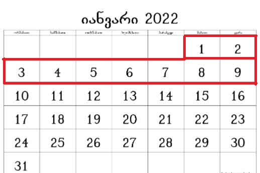 საქართველოში 1-ელი იანვრიდან 10 იანვრამდე პერიოდი უქმე დღეებად იყო გამოცხადებული. უწყებათაშორის საკოორდინაციო საბჭოსთან არსებული საოპერაციო შტაბის ინფორმაციით, აღნიშნული გადაწყვეტილება საჯარო დაწესებულებებს ეხებოდა, კერძო სტრუქტრურებს კი გადაწყვეტილების მიღება თავად შეეძლოთ.