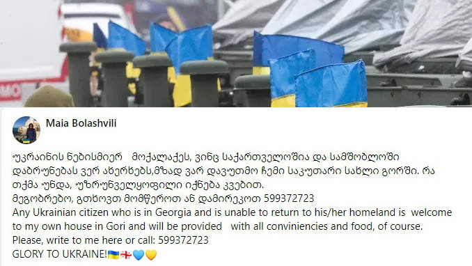 ,,უკრაინის ნებისმიერ მოქალაქეს, ვინც საქართველოშია და სამშობლოში დაბრუნებას ვერ ახერხებს, მზად ვარ, დავუთმო ჩემი საკუთარი სახლი გორში. რა თქმა უნდა, უზრუნველყოფილი იქნება კვებით. მეგობრებო, გთხოვთ მომწეროთ ან დამირეკოთ 599372723“, - ამის შესახებ ინფორმაციას სოციალური ქსელით ავრცელებს გორის მუნიციპალიტეტის საკრებულოს წევრი მაია ბოლაშვილი.