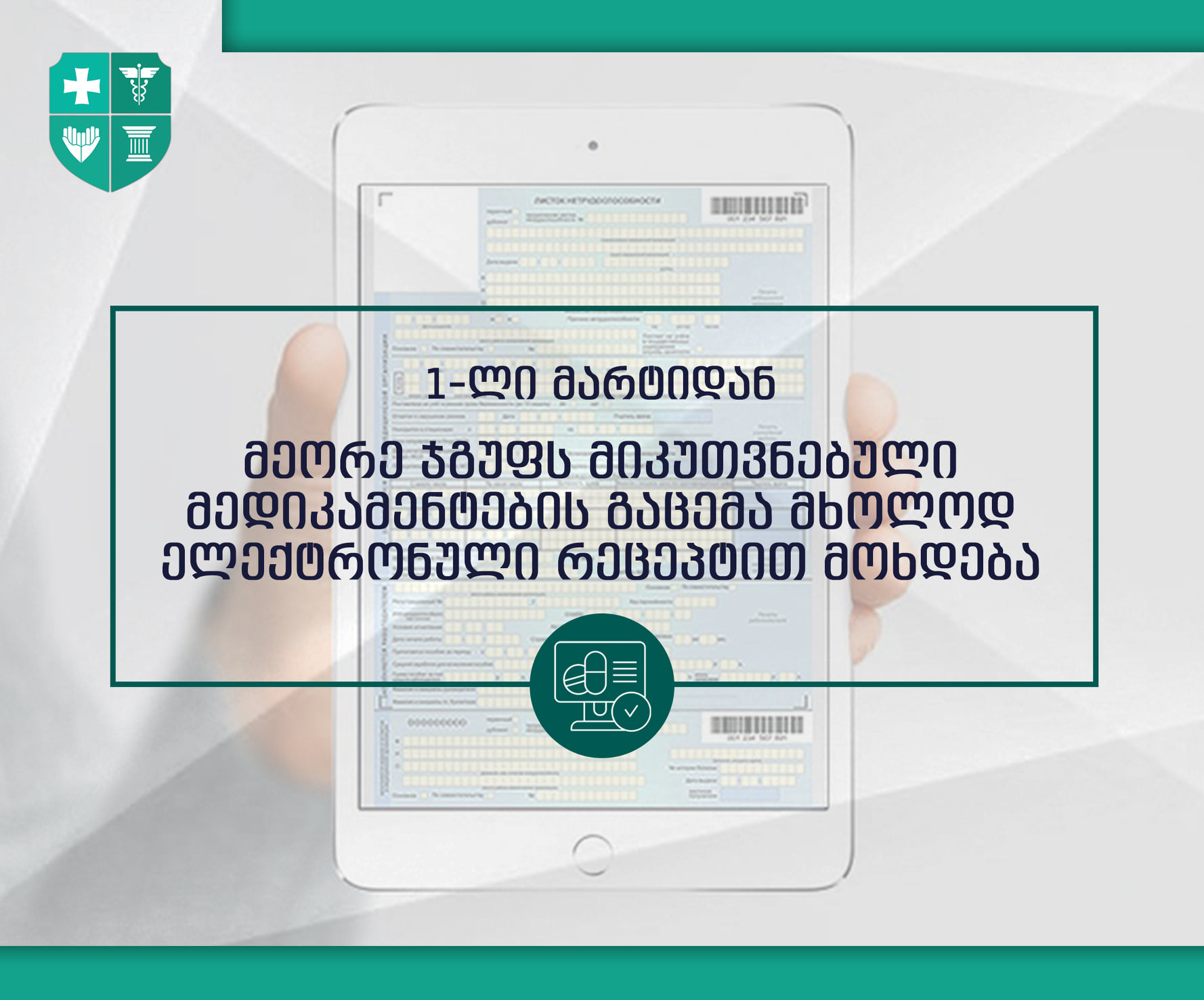 დევნილთა, შრომის, ჯანმრთელობისა და სოციალური დაცვის სამინისტროს ინფორმაციით, ქვეყნის მასშტაბით, სამედიცინო მომსახურების მიმწოდებელი ყველა დაწესებულება და ექიმი ვალდებულია, დღეიდან, 1-ლი მარტიდან, მეორე ჯგუფისთვის მიკუთვნებული ფარმაცევტული პროდუქტი გამოწეროს მხოლოდ ელექტრონულად, ფორმა №3 რეცეპტის საშუალებით. ამასთან, ექიმი ვალდებულია, სტაციონარული დაწესებულებიდან პაციენტის გაწერისას, მისთვის მედიკამენტური დანიშნულების მიცემის შემთხვევაში, გამოწეროს ელექტრონული რეცეპტი. ზემოხსენებული უწყების ინფორმაციით, მოთხოვნა ასევე ვრცელდება სტომატოლოგიურ დაწესებულებებზეც.