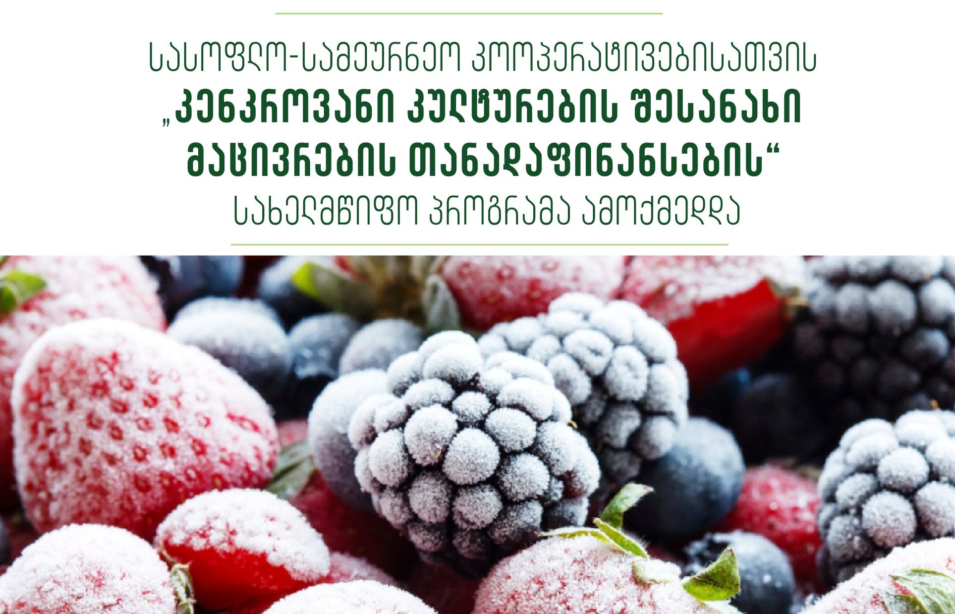 საქართველოს მთავრობის გადაწყვეტილებით, სასოფლო-სამეურნეო კოოპერატივებისთვის, კენკროვანი კულტურების შესანახი მაცივრების თანადაფინანსების ახალი სახელმწიფო პროგრამა ამოქმედდა. აღნიშნული პროექტი, „დანერგე მომავალი“-ს ქვეკომპონენტის ფარგლებში გაშენებული კენკროვანი კულტურების ბაღებიდან მიღებული მოსავლის აგროტექნოლოგიური სტანდარტების დაცვით შესანახად სპეციალური სამაცივრე კონტეინერის შეძენის თანადაფინანსებას გულისხმობს.