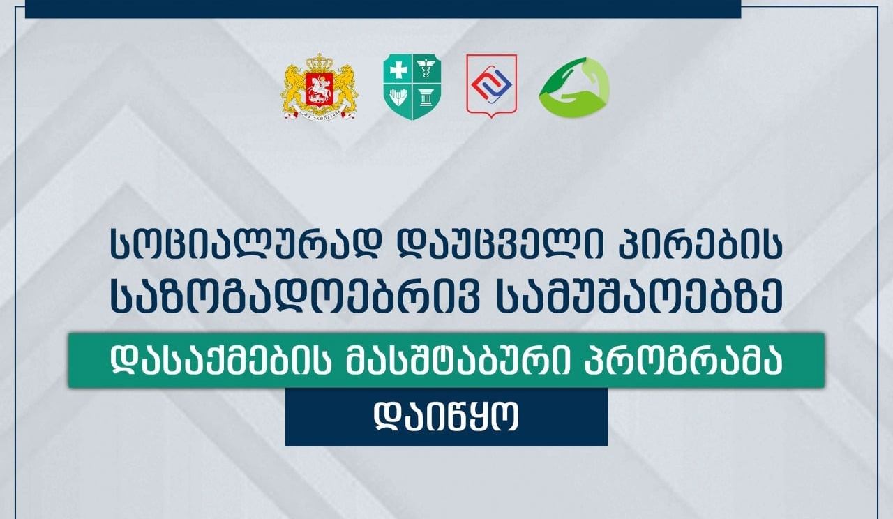 სოციალურად დაუცველი პირების საზოგადოებრივ სამუშაოებზე დასაქმების მასშტაბური პროგრამა დაიწყო. სოციალური მომსახურების სააგენტოს განმარტებით, პროგრამაში ჩართვა 18 წლის და უფროსი ასაკის იმ შრომისუნარიან პირებს შეუძლიათ, ვისი ოჯახის სარეიტინგო ქულა არ აღემატება 120 000-ს და იღებენ მიზნობრივ სოციალურ დახმარებას.