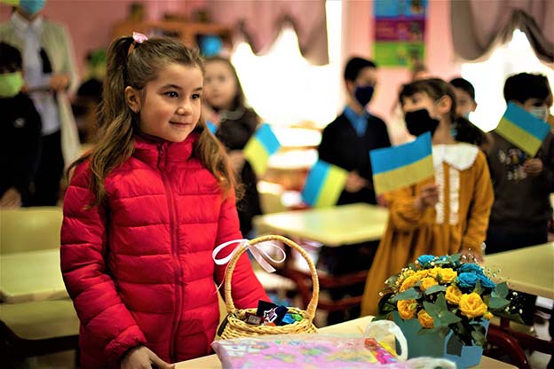 თანადგომის ნიშნად, მარიამ მძინარაშვილს თანაკლასელები უკრაინის დროშებით შეხვდნენ.