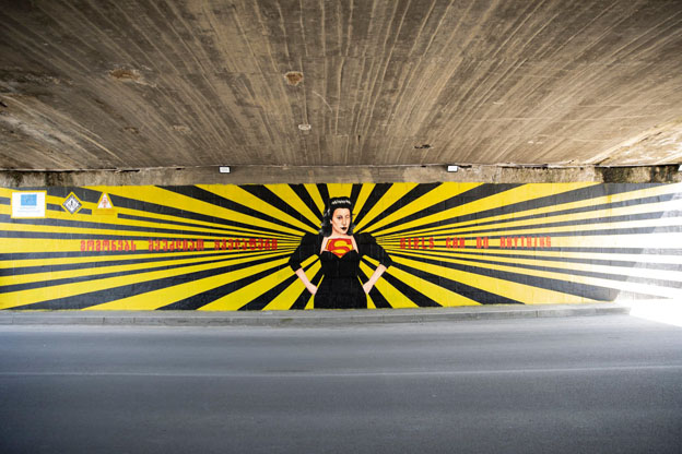 გორში, ბარნოვის ქუჩაზე მდებარე საავტომობილო გზის მიწისქვეშა გასასვლელის კედელზე ახალი სტენსილი გამოჩნდა - ახალგაზრდა ქალი, სუპერშესაძლებლობებით.