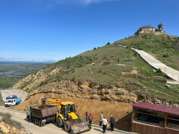 სააგენტოს თანამშრომლებმა ფერდობიდან ჩამოშლილი მიწის მასისგან გაწმინდეს და წყლის ჭავლით გადარეცხეს ტაძარამდე მისასვლელი საავტომობილო გზა და სანიაღვრე არხები.