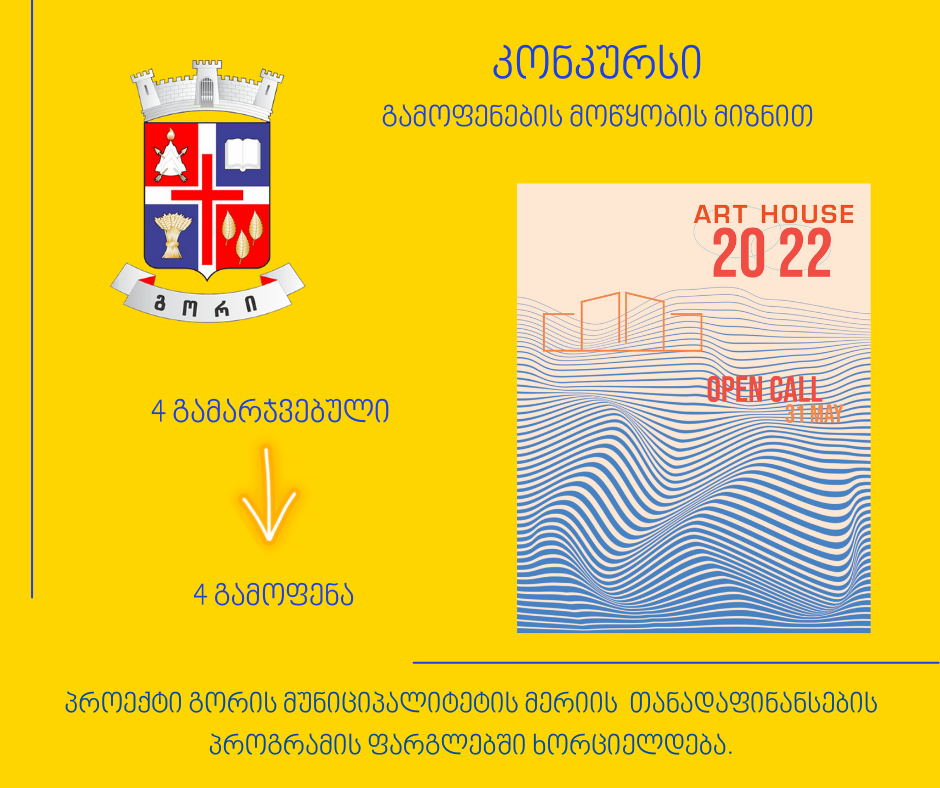 ხელოვნების სახლის „Art House“ -ი პროექტი გორის მუნიციპალიტეტის მერიის საგანმანათლებლო, კულტურული, სპორტული და ახალგაზრდული ღონისძიებების ხელშეწყობის პროექტების თანადაფინანსების პროგრამის ფარგლებში ხორციელდება.