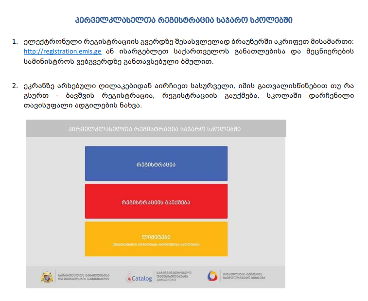 GMnews გაგაცნობს მოსწავლის რეგისტრაციის ინსტრუქციას - მითითებულ ელექტრონულ მისამართზე გადასვლის შემდეგ, აირჩიეთ: რეგისტრაცია. შემდეგ ავსებთ მოსწავლის მონაცემებს: პირადი ნომერი, სახელი, გვარი. მომდევნო ეტაპზე შეგყავთ მშობლის (ერთ-ერთის) მონაცემები: პირადი ნომერი, სახელი, გვარი, ტელეფონის ნომერი, ელ.ფოსტა. ცნობისთვის, ელექტრონული ფოსტის გარდა ყველა ველის შევსება სავალდებულოა. მომდევნო ეტაპზე კი ირჩევთ სასურველ სკოლას, ამისთვის შესაბამის ველებში უნდა შეავსოთ მონაცემები სასურველი რეგიონის, რაიონის, სკოლის, სექტორის (ქართული, რუსული...), სასურველი ცვლის და მისამართის შესახებ.