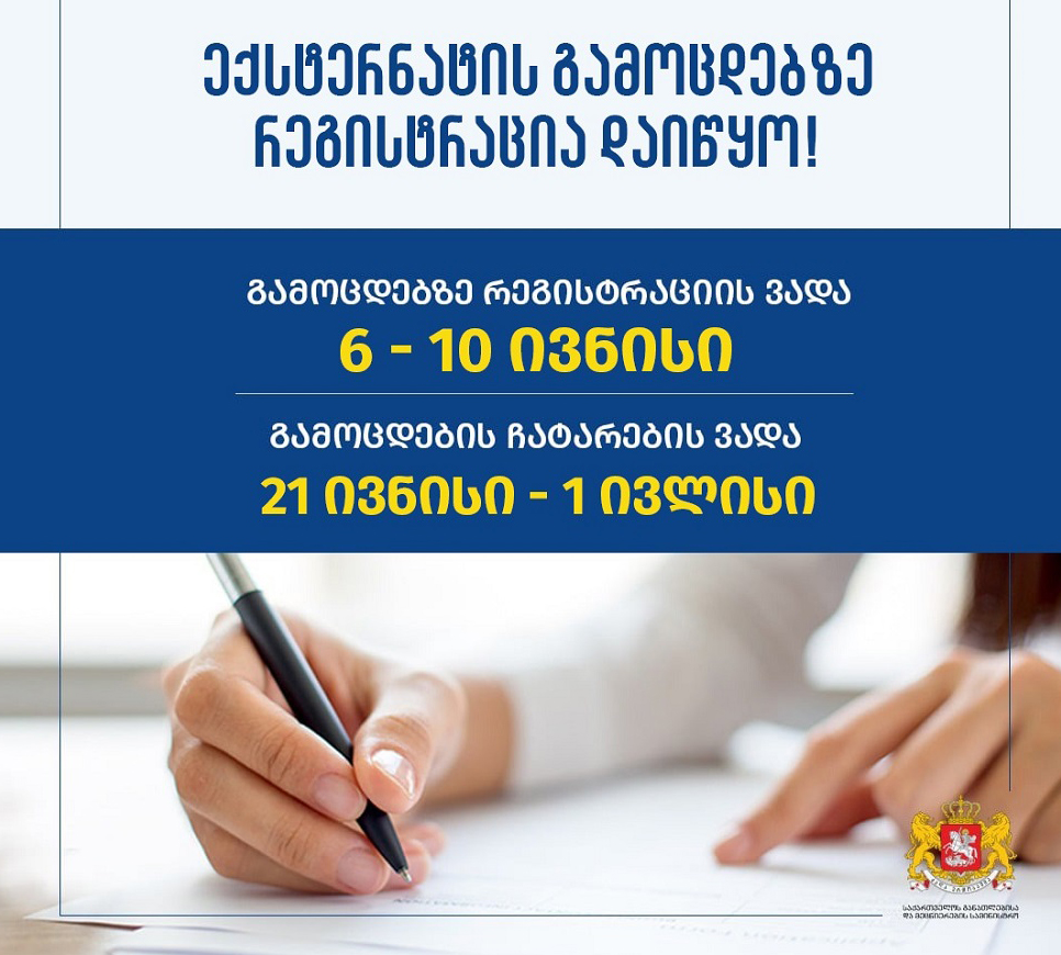 საქართველოს განათლებისა და მეცნიერების სამინისტრომ I-XII კლასების პროგრამის ექსტერნატის ფორმით დაძლევის მსურველების რეგისტრაცია დაიწყო. მსურველები გამოცდაზე დარეგისტრირებას 2022 წლის 6 ივნისიდან 10 ივნისის ჩათვლით შეძლებენ, ხოლო გამოცდები 2022 წლის 21 ივნისიდან 1 ივლისის ჩათვლით ჩატარდება.