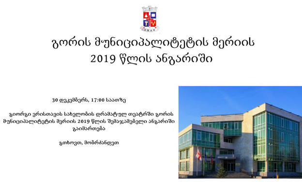 30 დეკემბერს, 17:00 საათზე, გიორგი ერისთავის სახელობის გორის სახელმწიფო დრამატული თეატრის დიდ დარბაზში, გორის მუნიციპალიტეტის მერი კონსტანტინე თავზარაშვილი 2019 წელს განხორციელებულ სამუშოებს შეაჯამებს.