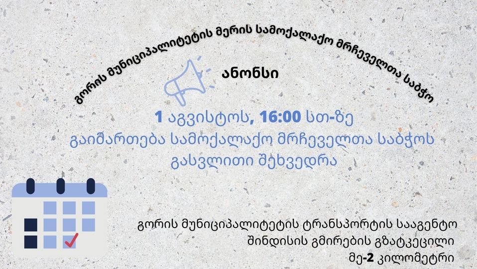 „საკითხის აქტუალურობიდან გამომდინარე, გორის მუნიციპალიტეტის მერიის სამოქალაქო მრჩეველთა საბჭოს მორიგი სხდომა დაეთმობა გორის მუნიციპალიტეტში ტრანსპორტის საკითხს. პრობლემების ან მოსაზრებების შესახებ შეგიძლიათ მოგვწეროთ საბჭოს ელექტრონული ფოსტის მისამართზე: gorismerismrchevltasabcho@gmail.com“, - აღნიშნულია გორის მუნიციპალიტეტის მერიის სამოქალაქო მრჩეველთა საბჭოს მიერ გავრცელებულ ინფორმაციაში.