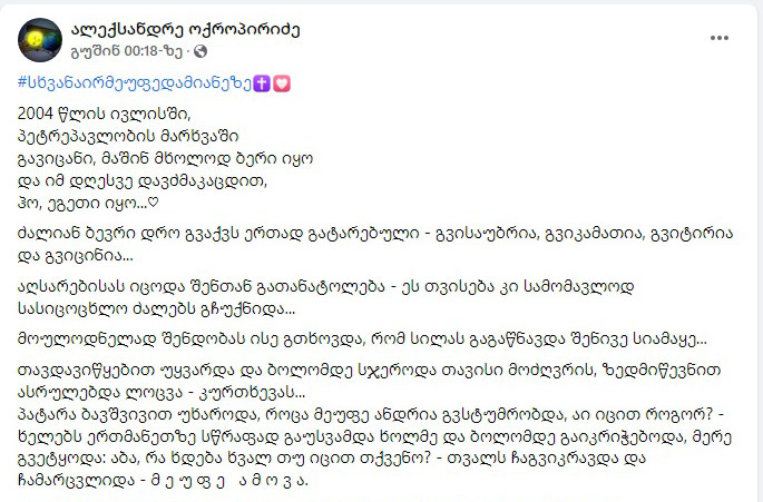 ძალიან ბევრი დრო გვაქვს ერთად გატარებული - გვისაუბრია, გვიკამათია, გვიტირია და გვიცინია. აღსარებისას იცოდა შენთან გათანატოლება - ეს თვისება კი სამომავლოდ სასიცოცხლო ძალებს გჩუქნიდა, - წერს ,,ფეისბუქის“ საკუთარ გვერდზე ალექსანდრე ოქროპირიძე.