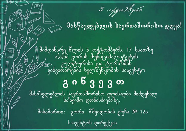 გორის მუნიციპალიტეტის მერიის კულტურისა და ტურიზმის განვითარების ხელშეწყობის სააგენტოს ორგანიზებით, გორში, მასწავლებლის საერთაშორისო დღე აღინიშნება.